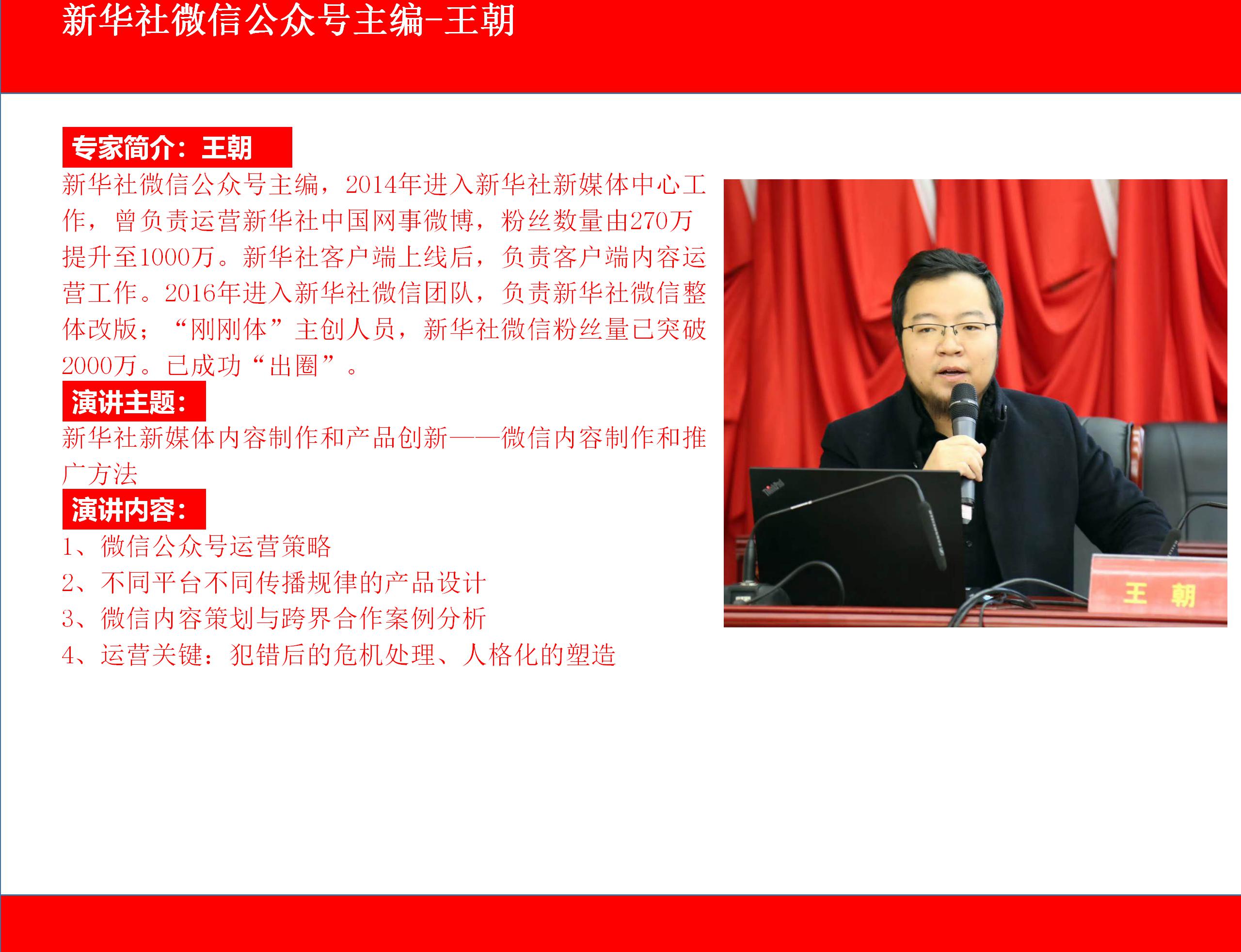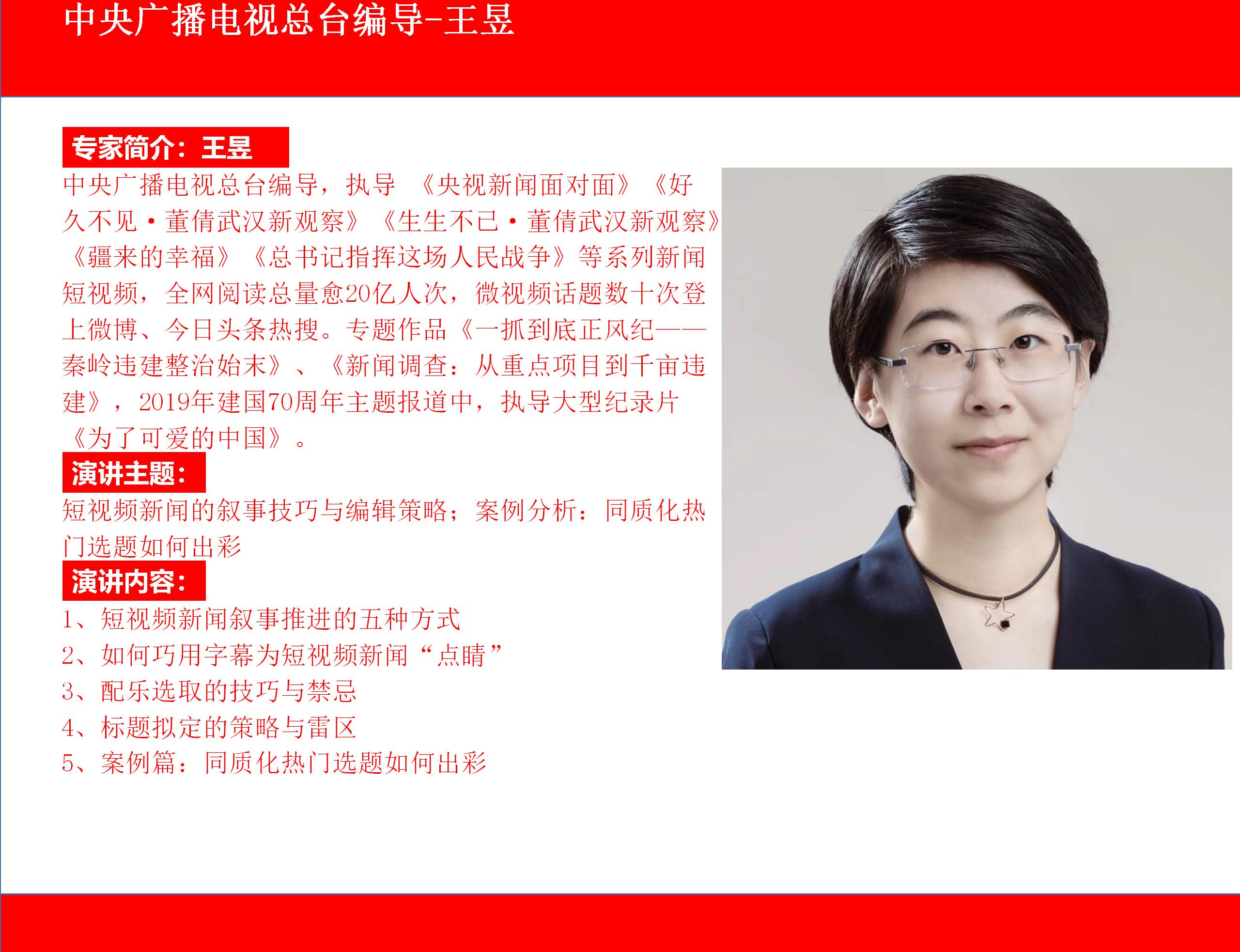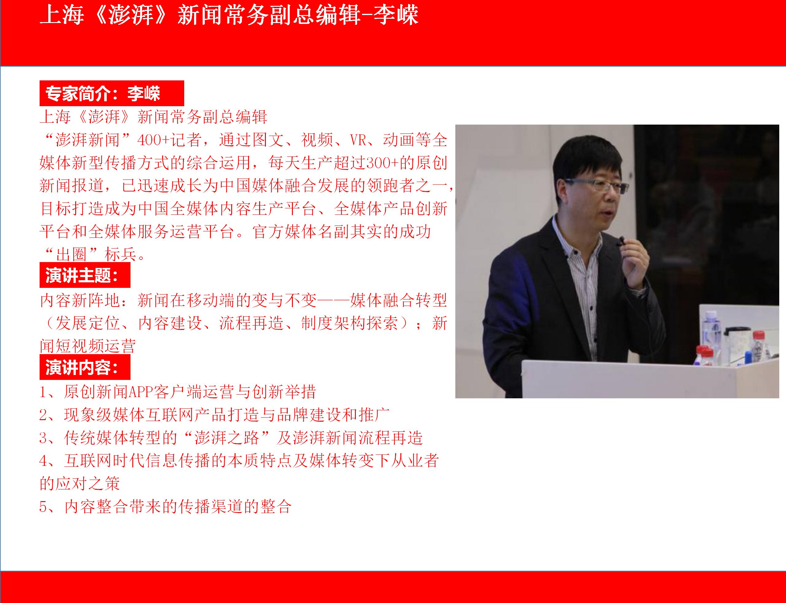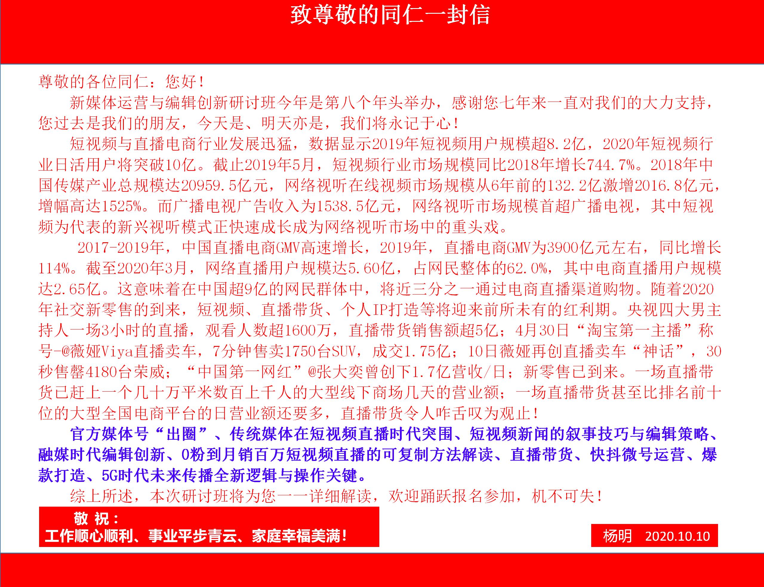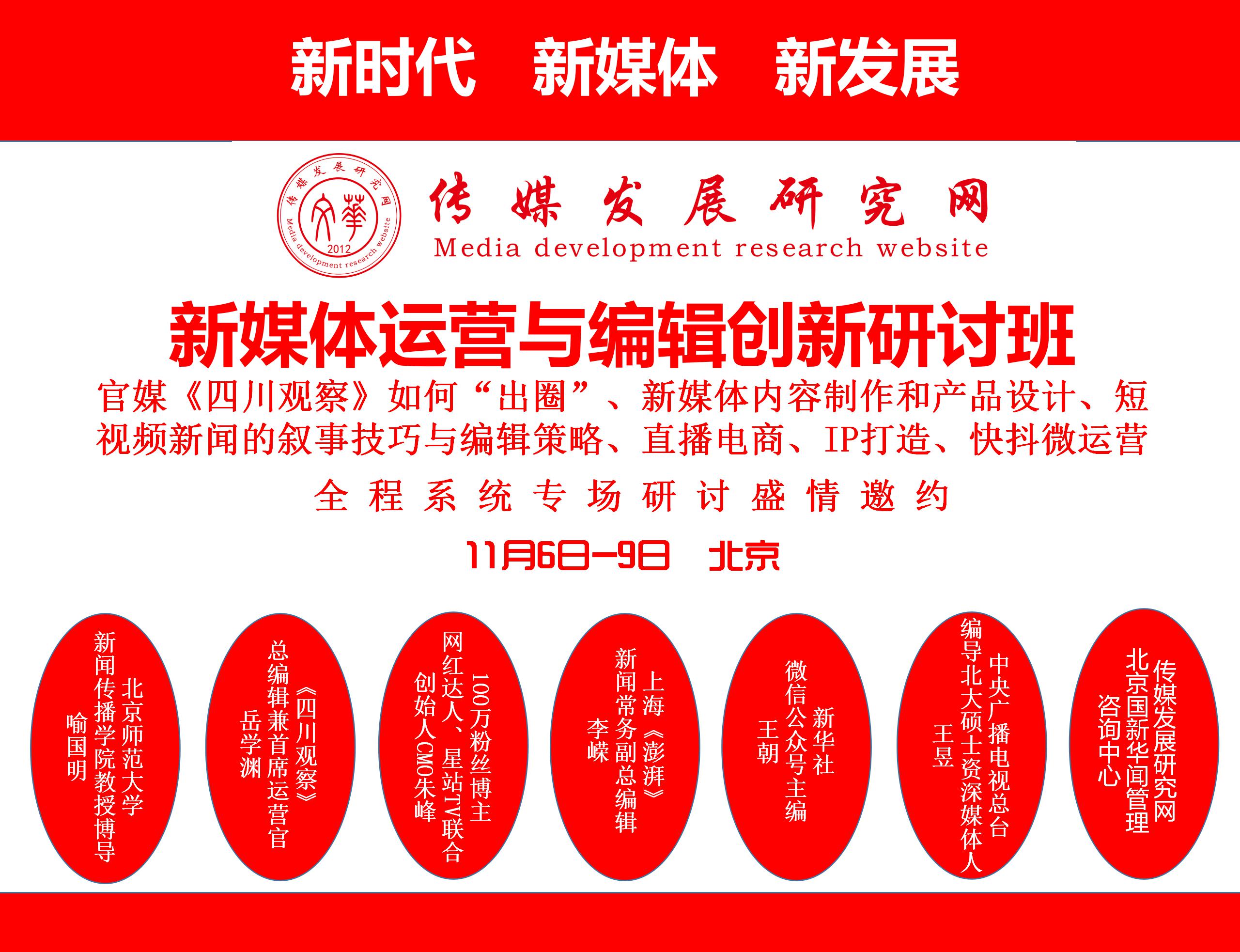 《四川觀(guān)察》總編輯兼首席運營(yíng)官岳學(xué)淵-媒體號“出圈”標兵抖音短視頻運營(yíng)、5G時(shí)代未來(lái)傳播操作關(guān)鍵-知名大咖教授喻國明為您詳細解讀、直播帶貨一線(xiàn)網(wǎng)紅快手運營(yíng)策略-星戰TV創(chuàng )始人清華大學(xué)年級第一朱峰、短視頻敘事與編輯策略-央視編導王昱北大高才女、媒體融合轉型發(fā)展-上海“澎湃”新聞 總編輯李嶸、微信公號運營(yíng)及產(chǎn)品創(chuàng )新-新華社微信公眾號操盤(pán)手王朝 ,最新最落地融媒報道案例、采、編、策、發(fā)布、深度解析,“新媒體運營(yíng)與編輯創(chuàng )新研討班”相約最佳的季節,最美的北京,2020年11月6-9日歡迎踴躍報名參加!![]()