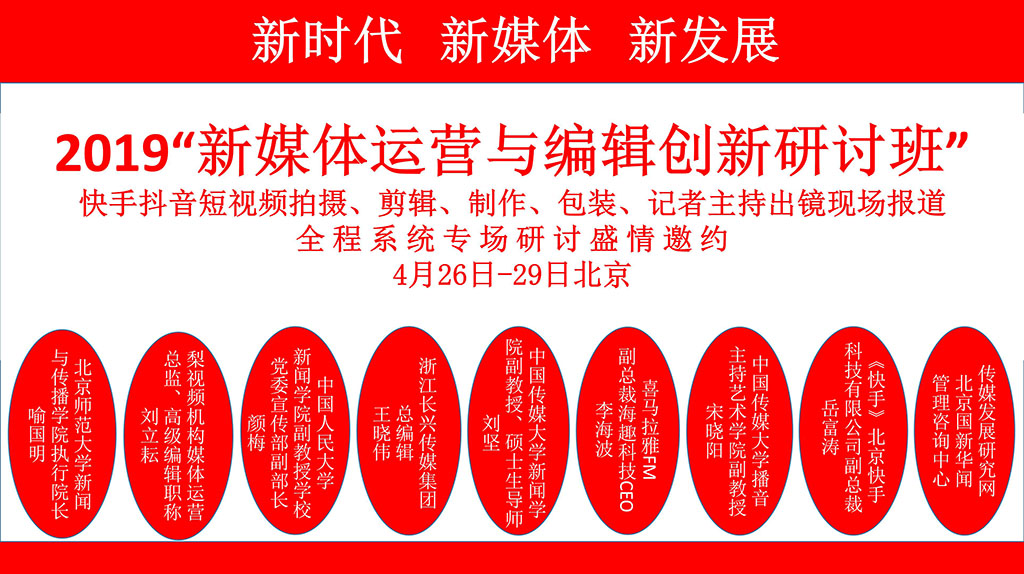 我們定于2019.4.26日—29日在北京舉辦一期:“新媒體運營(yíng)與編輯創(chuàng )新研討班——短視頻拍攝、剪輯、包裝、制作、記者主持出鏡報道研討班”的活動(dòng),誠邀您的光臨!現活動(dòng)正火爆進(jìn)行報名中,再次對您的支持與厚愛(ài)我們表示由衷的感謝!對您的支持我們無(wú)以回報,只有以匠心精神,竭盡全力,再接再厲,認認真真做好我們的每一項工作來(lái)回饋給您,只有這樣才能對得起您曾經(jīng)對我們的信任和一路同舟!