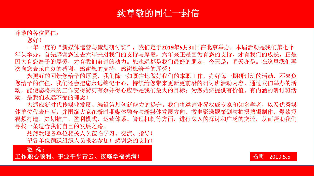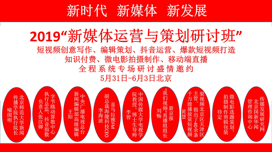 我們定于2019.5.31日—6.3日在北京舉辦一期:“新媒體運營(yíng)與策劃研討班”的活動(dòng),誠邀您的光臨!活動(dòng)現正火爆進(jìn)行報名中,對您的支持與厚愛(ài)我們表示由衷的感謝!對您的支持我們無(wú)以回報,只有以匠心精神,勤勤懇懇、認認真真做好我們的每一項工作來(lái)報答您給予的厚愛(ài),只有這樣才能對得起您曾經(jīng)對我們的信任和一路同舟!
