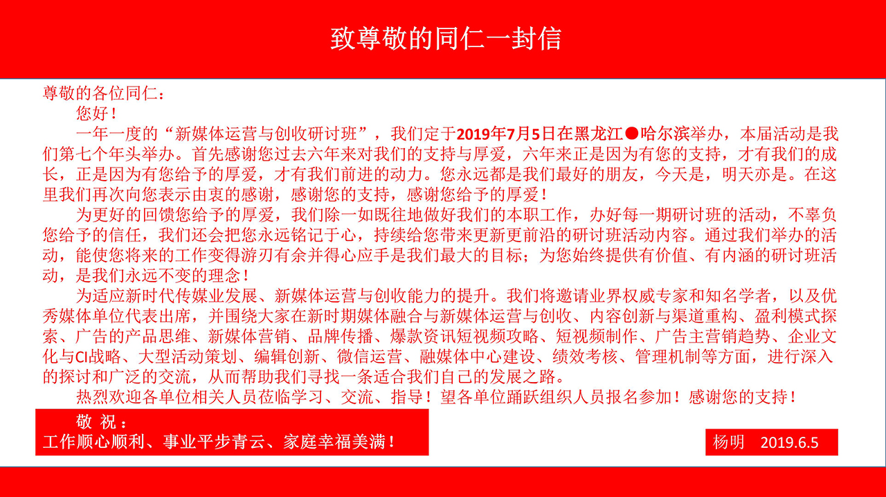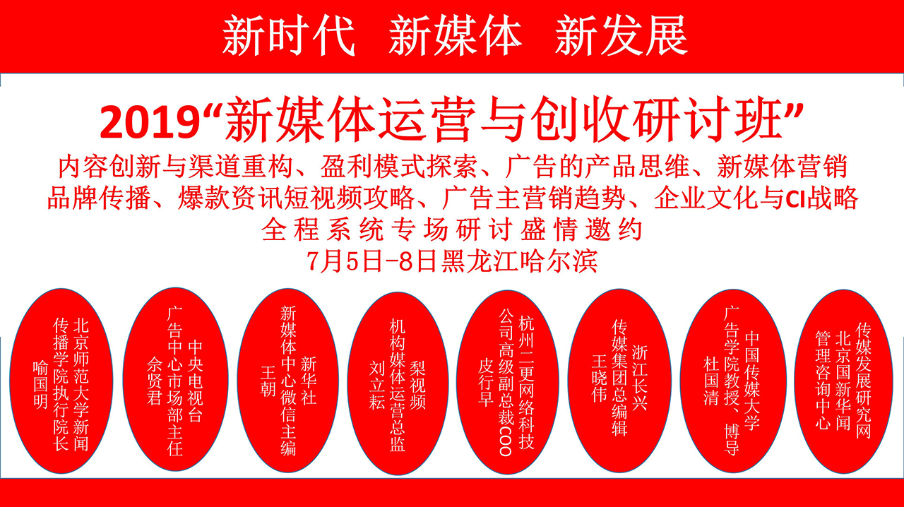 我們定于2019.7.5日—8日在哈爾濱舉辦一期:“新媒體運營(yíng)與創(chuàng )收研討班”的活動(dòng),誠邀您的光臨!活動(dòng)現正火爆進(jìn)行報名中,對您的支持與厚愛(ài)我們表示由衷的感謝!對您的支持我們無(wú)以回報,只有以匠心精神,勤勤懇懇、認認真真做好我們的每一項工作來(lái)報答您給予的厚愛(ài),只有這樣才能對得起您曾經(jīng)對我們的信任和一路同舟!