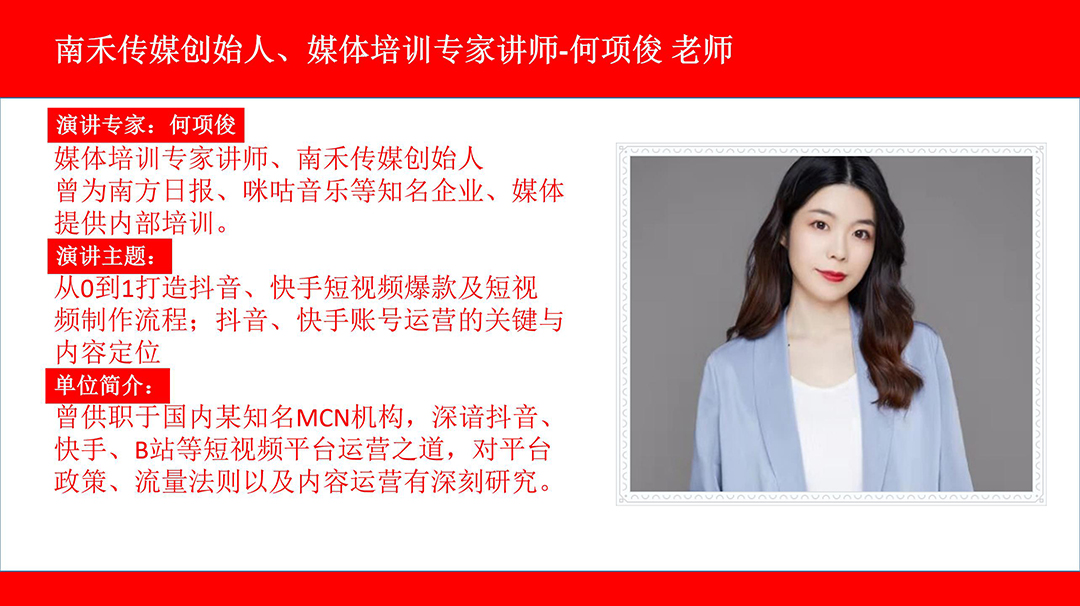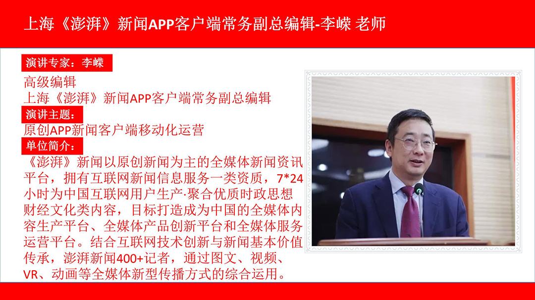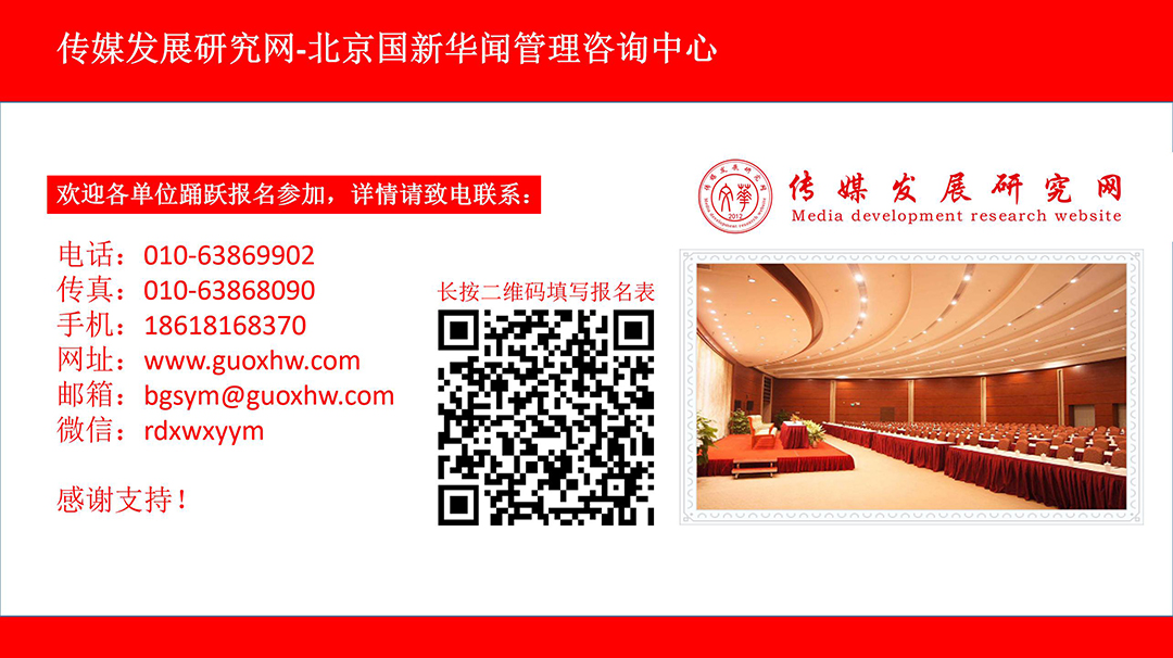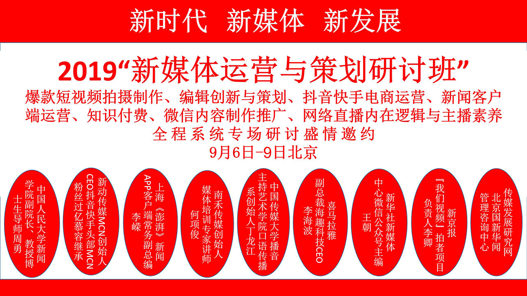 2019.9.6-9日 北京 新媒體運營(yíng)發(fā)展、抖音快手運營(yíng)及電商拓展、音頻視頻內容制作、原創(chuàng )新聞客戶(hù)端APP移動(dòng)化運營(yíng)、網(wǎng)絡(luò )直播的內在邏輯與網(wǎng)絡(luò )主播的素質(zhì)養成、知識付費、微信的內容制作與推廣方法、移動(dòng)端直播、新聞短視頻的拍攝制作與傳播研討班